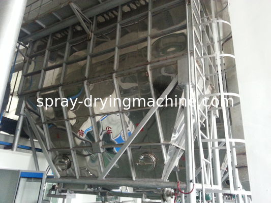 Powder from the drying chamber is collected in bag filter, while the outlet airleaves the system at the top via a suction fan.